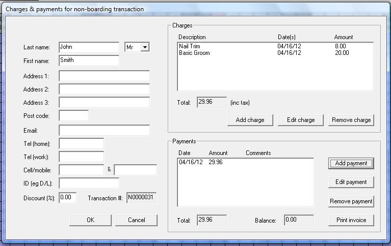 You can create transactions for clients whose animals are not boarded, eg selling merchandise to clients or carrying out tasks such as grooming. Next >>