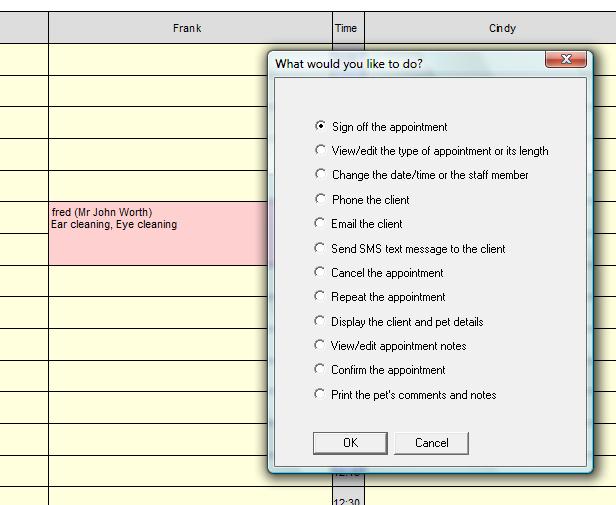 To sign off an appointment when it is complete, click on the appointment and select the first option in the list. Next >>